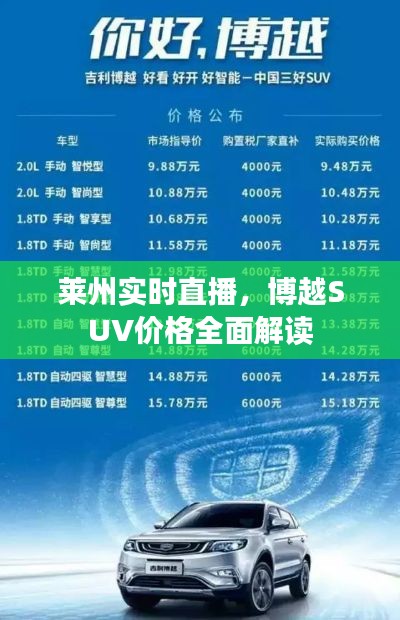 尊敬的各位观众朋友们,大家好!今天我们将为您带来一场关于莱州实时直播的特别报道,重点关注热门车型——博越SUV的价格动态,在这篇文章中,我们将为您全面解析博越SUV的价格情况,帮助您更好地了解这款车型的性价比及市场定位。
